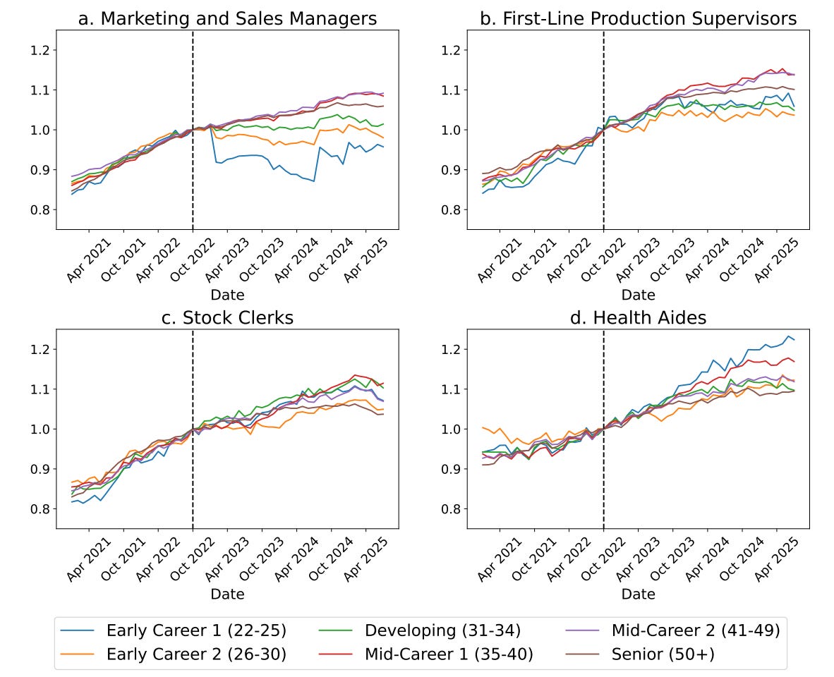 A recent Stanford study, drawing on ADP payroll data, confirms what many of us have seen firsthand: late-twenty-somethings in AI-exposed roles, especially in software, marketing and service functions, are experiencing employment drops of up to 13 percent compared to older peers and less automated jobs. Overall employment looks steady, which is why the shift doesn’t always show up in headline jobs numbers. But role by role, the impact is undeniable.